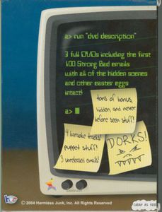 A handsome boxed set containing three full DVD's featuring the first one hundred Strong Bad e-mails, with all of the hidden scenes and other easter eggs intact!! Special features include three previously unreleased Strong Bad E-Mails! Also, hidden character and creator commentary!! Have fun trying to find 'em!! Four Karaoke Videos!! Over an hour of never-before-seen puppet stuff, behind the scenes action and other hilarious antics!! |